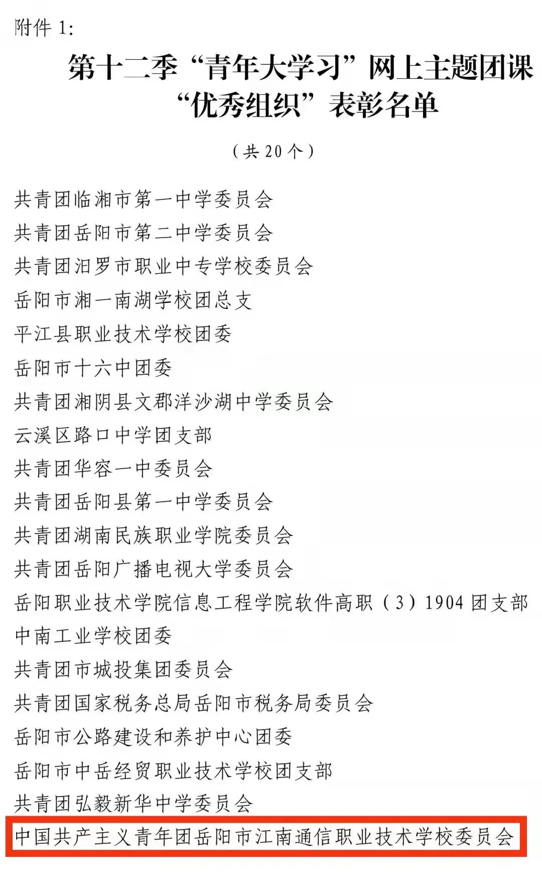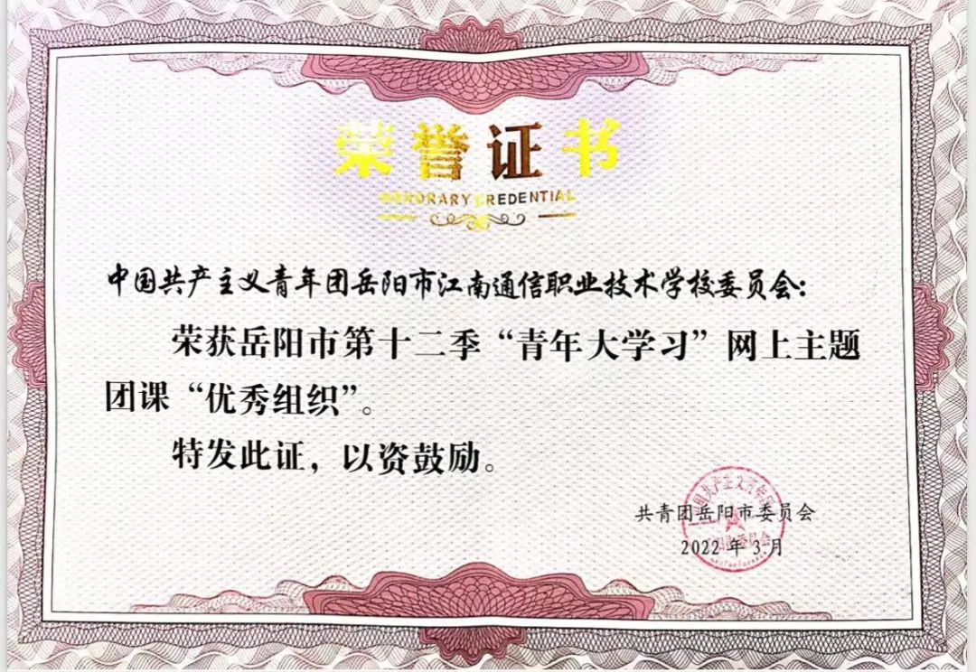 近日,從共青團岳陽市委員會傳來消息,我校榮獲岳陽市第十二季“青年大學(xué)習(xí)”網(wǎng)上主題團課“優(yōu)秀組織獎”。